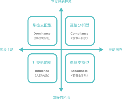 DISC理论根据是否处于友 好的环境、是否积极主动这两种情境下将人划分为:掌控支配型 (Dominance)、社交影响型(Influence)、稳健支持型 (Steadiness)、谨慎分析型(Compliance)。